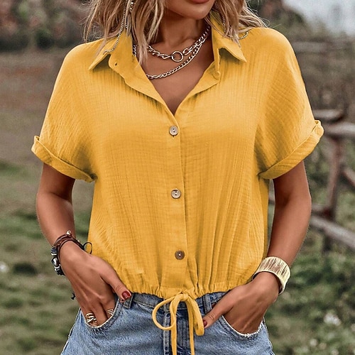 Camicia in lino sintetico da donna camicia casual camicia con bottoni arricciata coulisse bottoni colore solido semplice quotidiana elegante casual a maniche corte maniche a pipistrello scollo