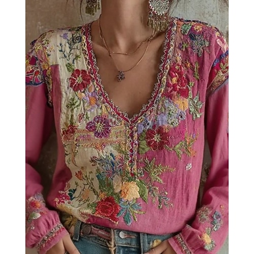 Per donna Camicia Camicia Boho Blusa Ricamato Floreale Grafico Bohemien Vintage Elegante Manica Lunga Scollo a V Top Regolari Quotidiano Ferie Uscire Rosa Estate Primavera