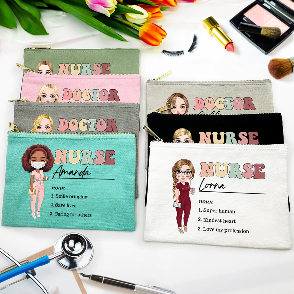 Personalizzato infermiere medico personaggio dei cartoni animati borsa trucco portatile in tela con nome regalo di compleanno per il personale medico