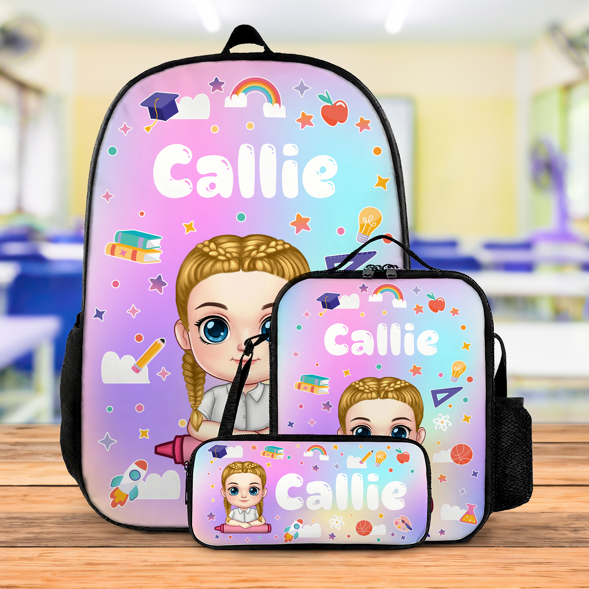Personalizzato multicolore libro arcobaleno personaggio cartone animato zaino pranzo borsa portamatite con nome Back to School regalo di compleanno per ragazzi ragazze