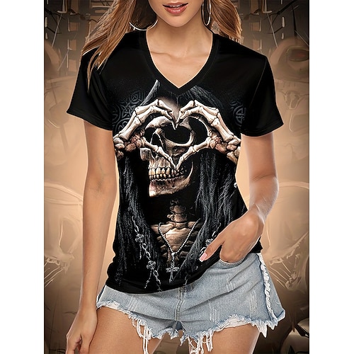 T Shirt da donna Teschi Grafica Strega Vintage Stile Classico Corto Manica Collo a V Regolare Tops Quotidiano Stampa Nera Estate Autunno Inverno