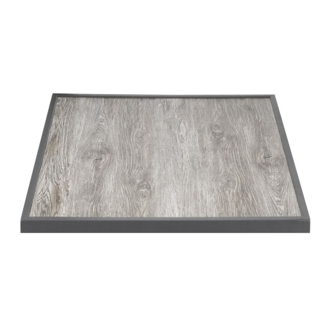 Bolero-Tischplatte aus gehärtetem Glas mit Holzmaserungseffekt für den Außenbereich, graue Zierleiste, 700 mm