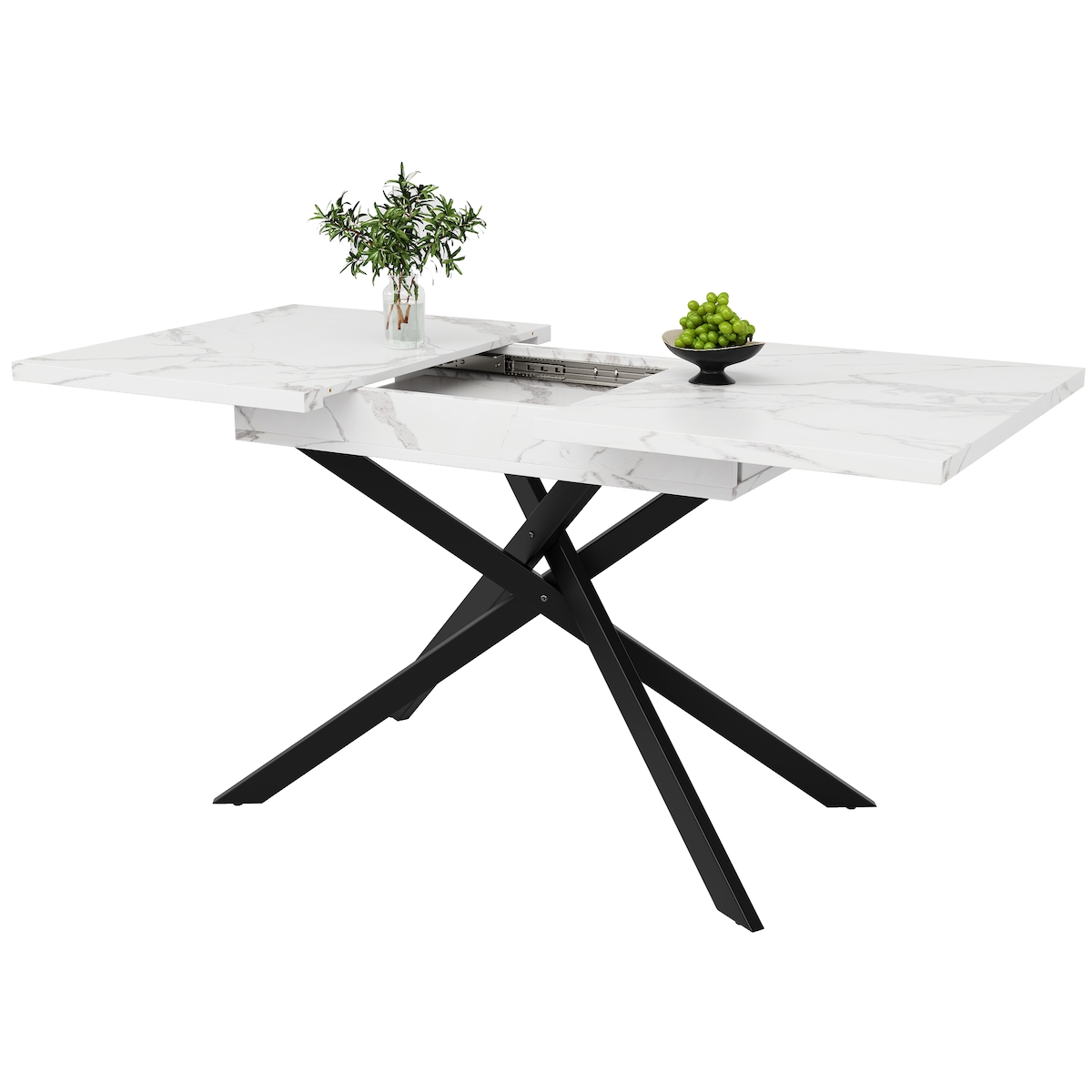 OKWISH Ausziehbarer Esstisch 160x80x77 cm Weiß+Schwarz mit Teleskopfunktion, marmorierte MDF Tischplatte, Kreuzgestell aus Metall, platzsparend