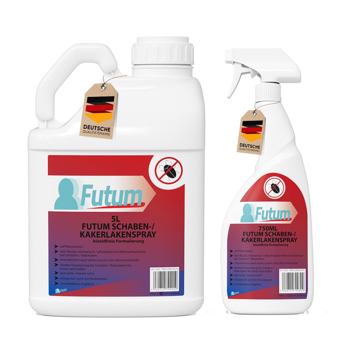FUTUM 5L + 750ml Schabenspray / Kakerlakenspray bekämpft Insekten, Eier, Larven ohne Biozide auf Wasserbasis, Sofortwirkung ohne Flecken