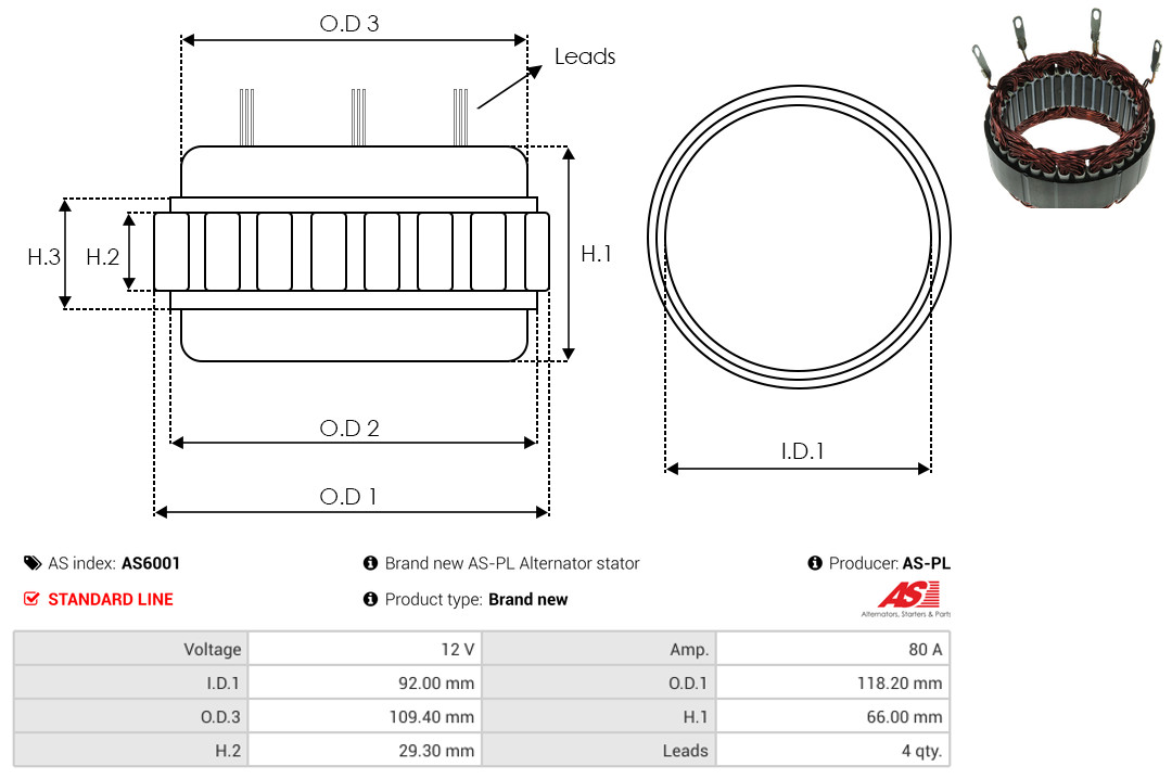 AS-PL Stator, Generator AS6001 Universal 12V 80A
