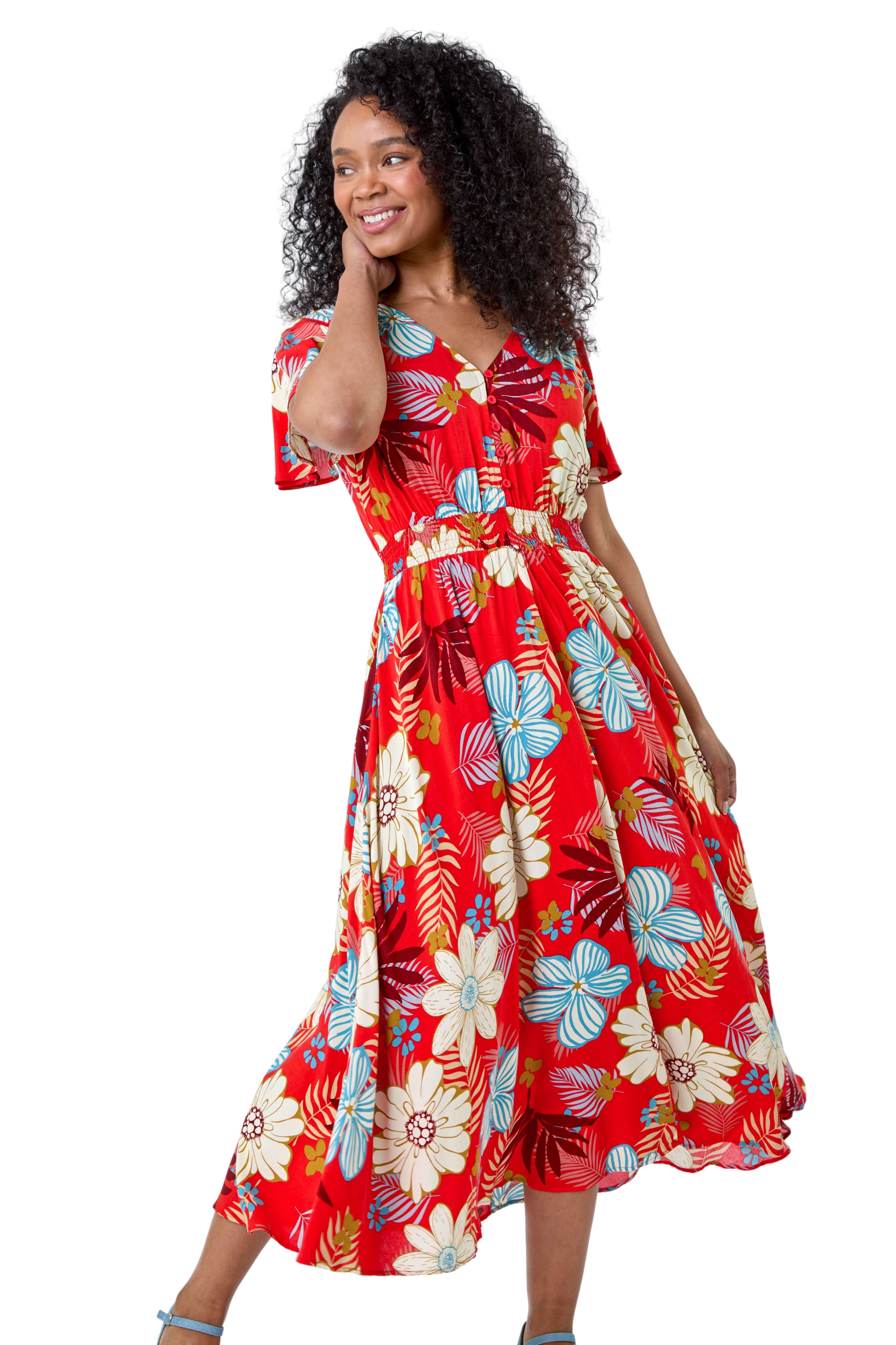 Roman Womens Petite Floral Print Shirred Midi Dress - Red - Size 10 UK | Roman Sale | Discount Designer Brands