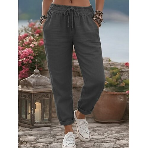 Per donna Pantaloni in cotone e lino Essenziale Lunghezza intera Misura del girovita medio Comodità Traspirabilità Inelastico Blu Grigio Nero Bianco Estate Primavera