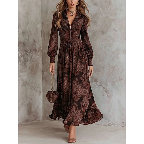 Per donna Abito maxi Abito a Tubino Casual Boho Quotidiano Ferie Paisley Manica Lunga Girocollo Marrone chiaro Autunno Inverno