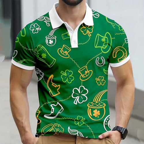 Polo Shirt da Uomo Shamrock del Giorno di San Patrizio a Manica Corta Camicie con Collo Abbigliamento Casual Athleisure Uso Quotidiano Outfit per Festival Stampa 3D Bottoni Primavera Autunno Inverno