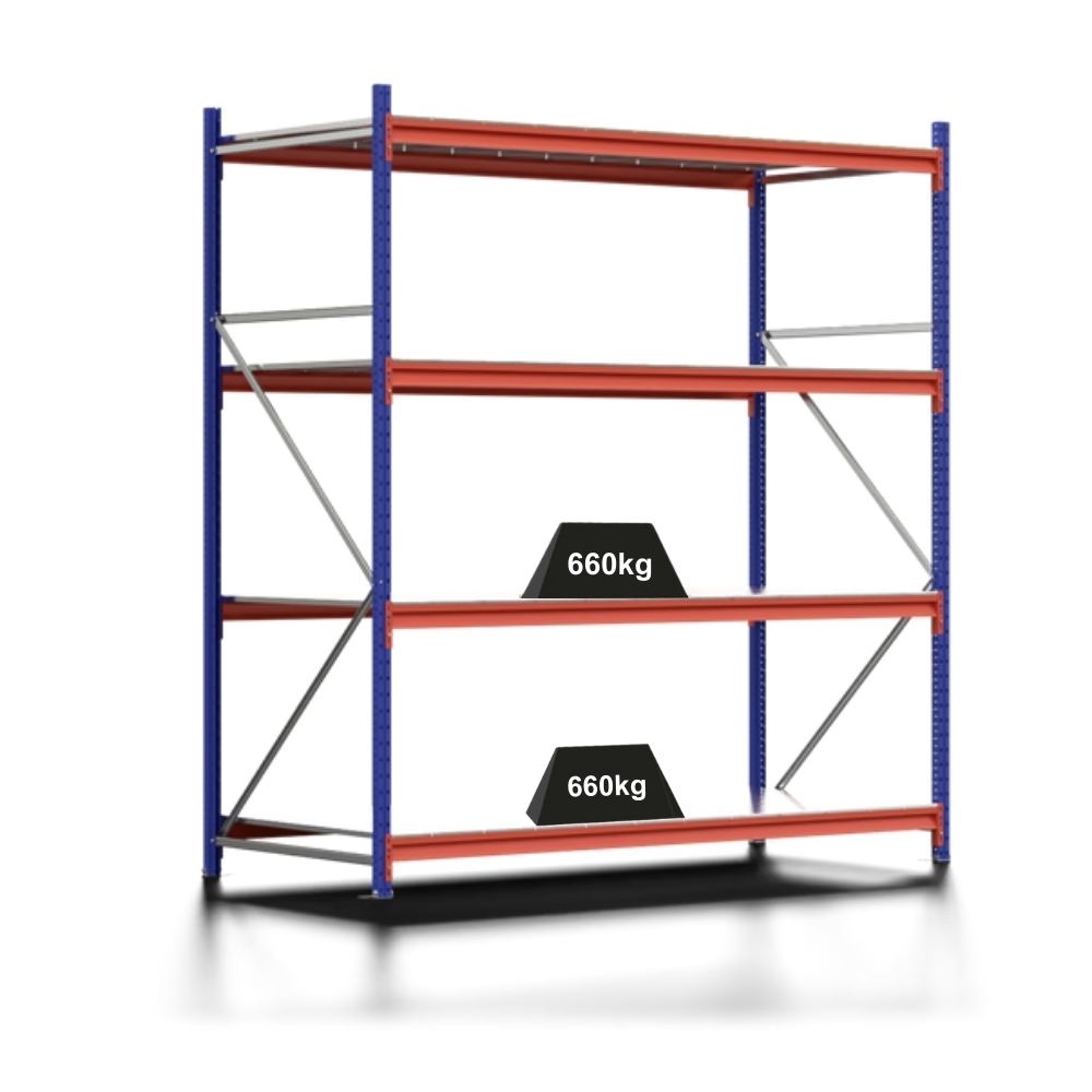 PROREGAL Weitspannregal MOOSE Stecksystem Omega-Profil, Grundregal, HxBxT 250x222x100cm, 4 Ebenen, Spanplatten-Fachboden, Fachlast 660kg, Blau/Orange