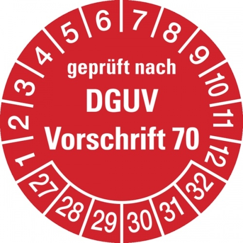 König Werbeanlagen Prüfplakette ab 27, geprüft nach DGUV Vorschrift 70, rot/weiß, Folie, Ø 30 mm - Bogen = 10 Plaketten - 30 mm Folie selbstklebend