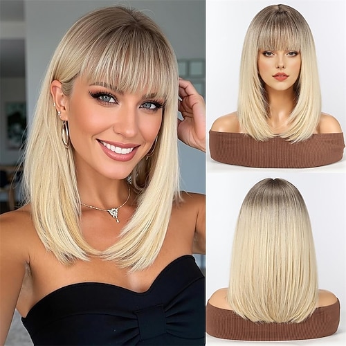 Parrucca bionda liscia a strati con radici scure per donna, parrucca resistente al calore con frangia per tutti i giorni