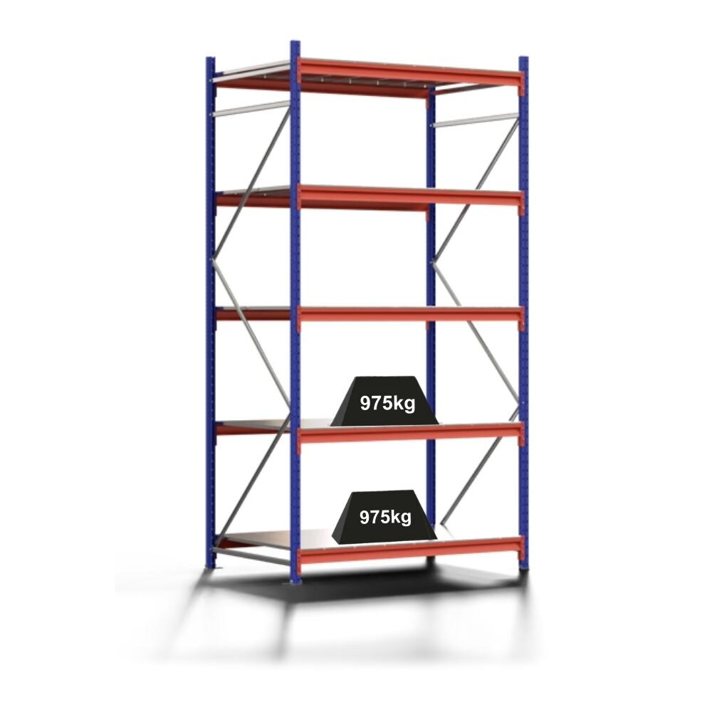 PROREGAL Weitspannregal MOOSE Stecksystem Omega-Profil, Grundregal, HxBxT 300x150x100cm, 5 Ebenen, Spanplatten-Fachboden, Fachlast 975kg, Blau/Orange