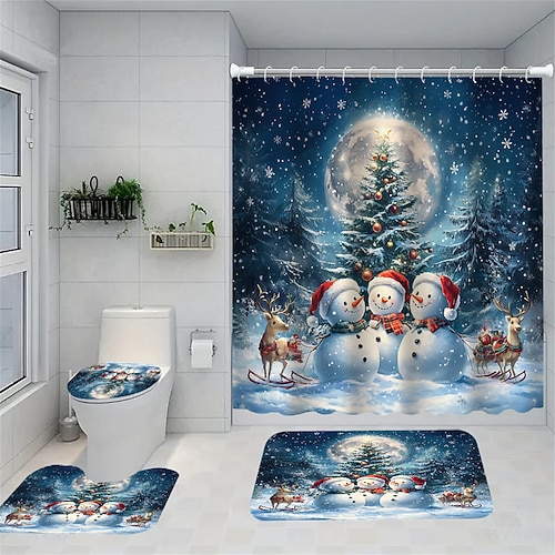 tenda da doccia in quattro pezzi, con sedile WC antiscivolo e robusto e tappetino da bagno – motivo a fiocco di neve con albero di Natale e pupazzo di neve, materiale in poliestere impermeabile con 12