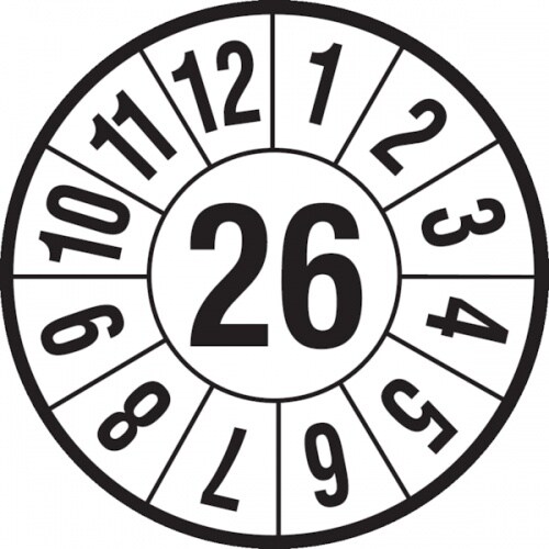 König Werbeanlagen Jahresprüfplaketten ab 26, Jahresfarben, Folie, Ø 40mm - Bogen = 10 Plaketten - 40 mm Folie selbstklebend