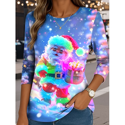 Natale Per donna Maglietta Grafico Babbo Natale Vintage Moda Elegante Manica Lunga Girocollo Top Regolari Quotidiano Weekend Stampato Blu Rosso Viola Fucsia Verde Estate Primavera Autunno Inverno