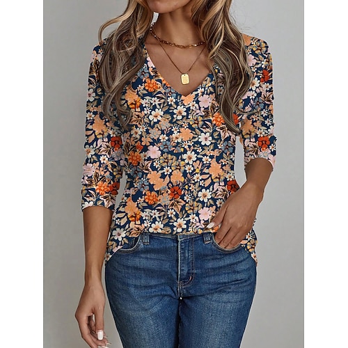 Per donna Maglietta Floreale Grafico Piante Vintage Elegante Classico Manica Lunga Girocollo Scollo a V Top Regolari Quotidiano Stampato Blu Primavera Autunno