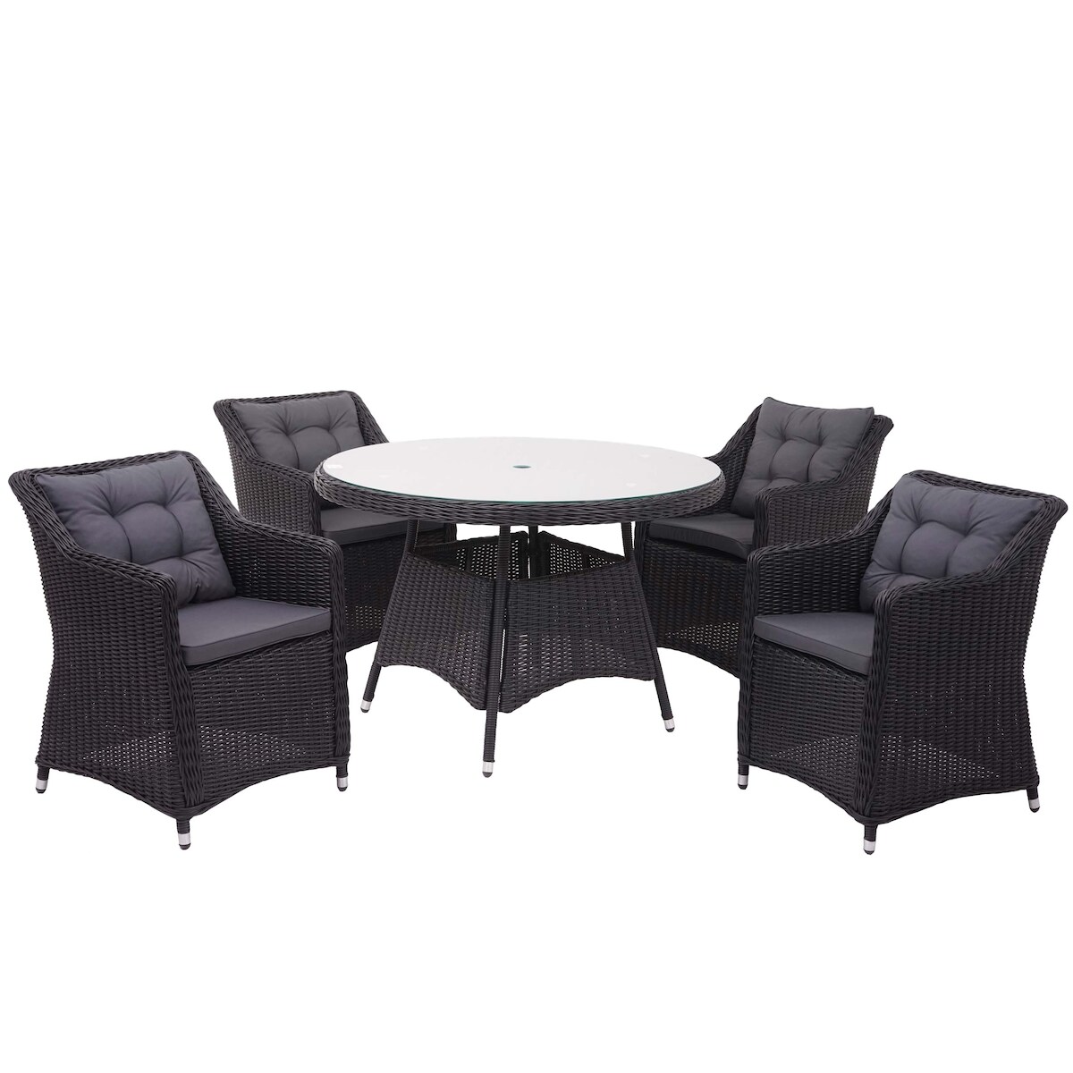 Mendler Poly-Rattan Garnitur HWC-F51, Garten-/Lounge-Set Sitzgruppe Tisch+4xStuhl, rundes Rattan anthrazit Kissen dunkelgrau