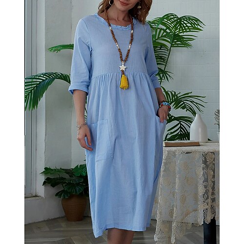 Per donna Abito Midi Vestito Casual Abito in cotone e lino Elegante Moda Moderno Quotidiano Vacanza Uscire Vestibilità comoda Semplice Manica 3/4 Girocollo Giallo Rosa Rosa Azzurro Estate Primavera