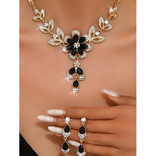 Collana e orecchini da donna in cristallo blu placcato oro con motivo floreale: eleganti gioielli da festa per eventi formali e celebrazioni serali
