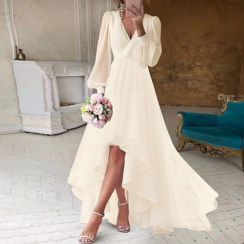 Matrimonio sulla spiaggia addio al nubilato piccolo abito bianco abiti per addio al nubilato abiti da matrimonio A-Line scollo a V manica lunga asimmetrico chiffon abiti da sposa con colore solido