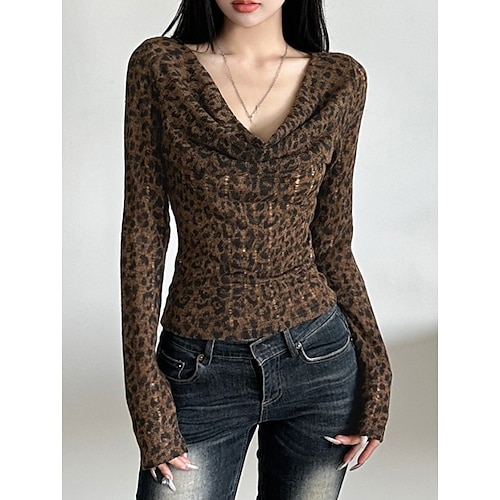 Per donna Camicia Leopardo Elegante Manica Lunga Scollo a Cascata Asimmetrico Quotidiano Ferie Drappeggiato Marrone Estate Primavera Autunno Inverno