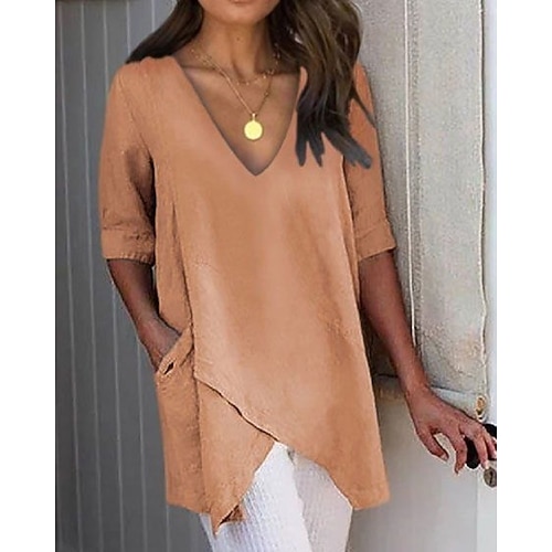 Per donna Camicie di cotone e lino Blusa Semplice Vintage Elegante Casual Mezza Manica Scollo a V Top Regolari Quotidiano Ferie Uscire Patchwork Asimmetrico Blu Giallo Arancione Verde Grigio Estate