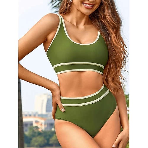Bikini da donna 2 pezzi costume da bagno colorblock alta vita snellente senza schiena vacanza beach wear striscia scollo a V senza maniche