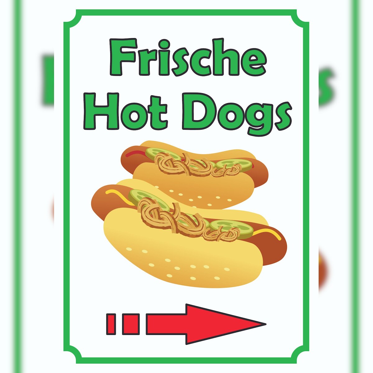 HB-Druck Frische Hot Dogs Schild Hochkant mit Pfeil rechts A6 (105x148mm)