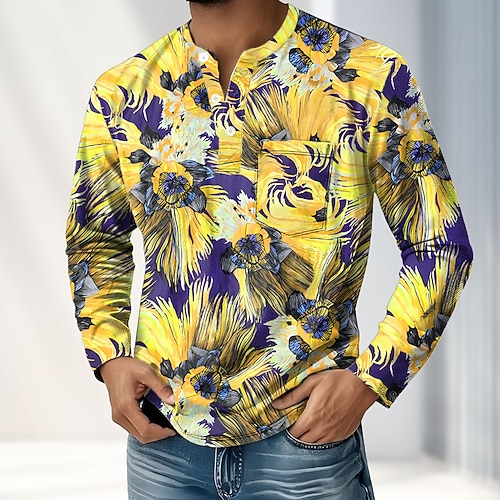 Per uomo Stampa Floreale Maglia Henley Maglietta Manica Lunga Retrò Vintage Casual Casuale Primavera Autunno Blu Giallo Arancione Henley Maglietta Henley