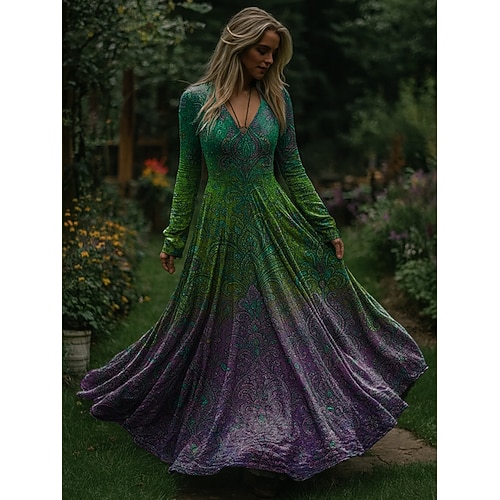 Natale Per donna Abito maxi Abito Pieghettato Festa Casual Boho Quotidiano Data Uscire Vestibilità regolare Ombre Albero di Natale Manica Lunga Scollo a V Blu Rosso Viola Verde Primavera Autunno