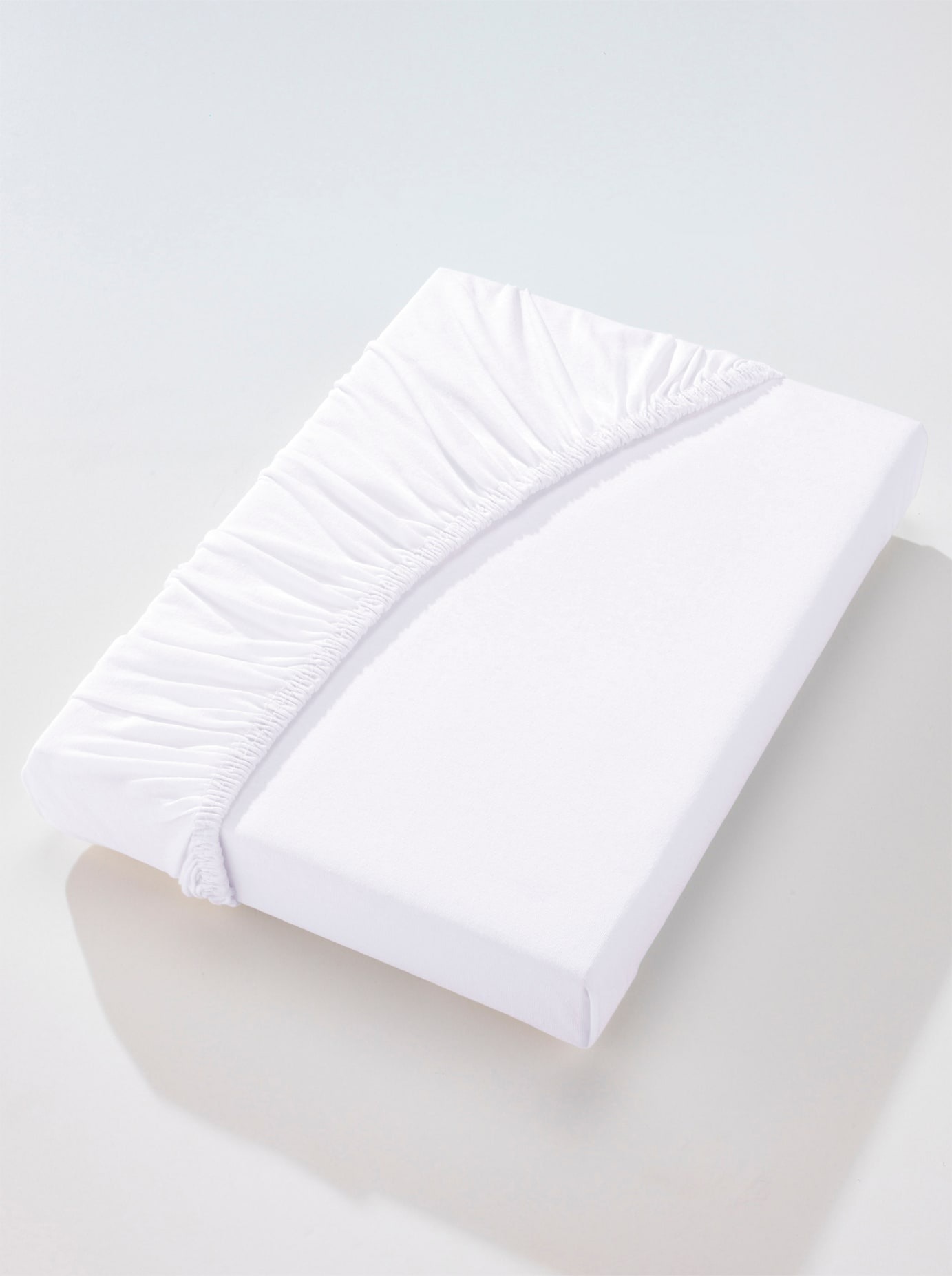 Spannbettlaken SCHIESSER "Elli aus 97% Baumwolle und 3% Elasthan", weiß, B:150cm L:200cm, Jersey-Elasthan, Obermaterial: 97% Baumwolle, 3% Elasthan, Bettlaken, Spannbettlaken, für hohe Matratzen und Boxspringbetten, MADE IN GREEN by OEKO-TEX