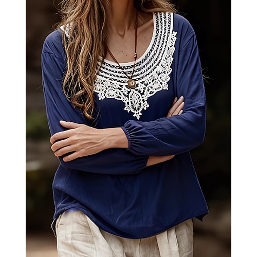 Per donna Blusa Top in pizzo Semplice Vintage Elegante Manica Lunga Girocollo Top Regolari Ferie Uscire Pizzo Patchwork Blu marino Estate Primavera