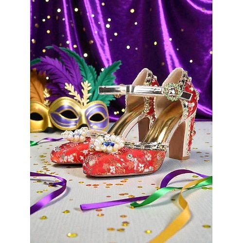 Scarpe Mary Jane con tacco a blocco ricamate e decorate con perle e strass per donne pump vintage per costumi di Carnevale festival e feste