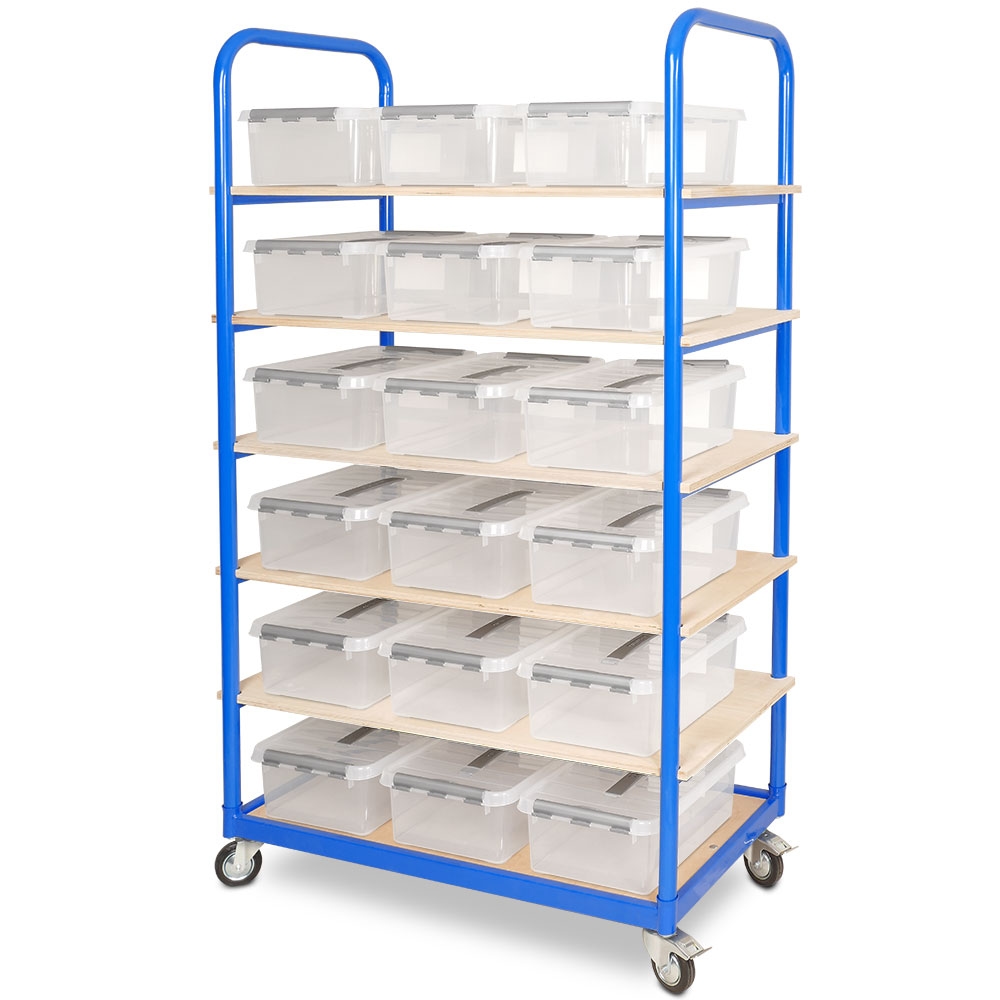 BRB Etagenwagen mit 6 Ebenen, BxTxH 1050x500x1690 mm, 4 Lenkrollen, 2 Rollen mit Feststellbremse mit 18 Clipboxen je 12 Liter