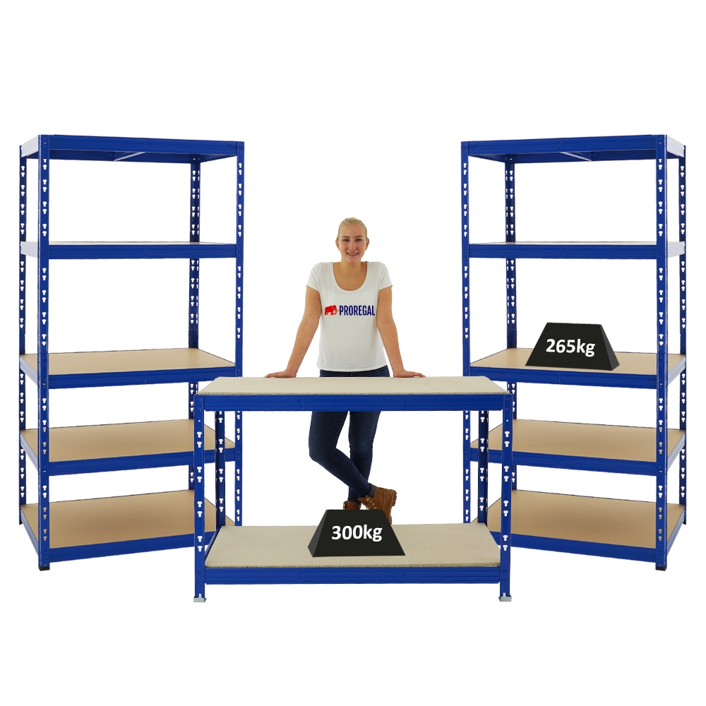 PROREGAL Mega Deal | 2x Schwerlastregal Tiger & 1x Werkbank Tiger | Fachlast bis 300kg | Blau | Stecksystem Lagerregal Regalsystem 2 Stk.