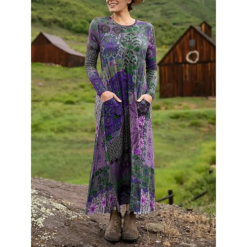 Per donna Abito maxi Tubino Vestito T-Shirt Vacanza Casual Boho Ferie Data Vestibilità regolare Floreale Grafico Geometrico Manica Lunga Girocollo Blu Viola scuro Rosa Rosso Primavera Autunno