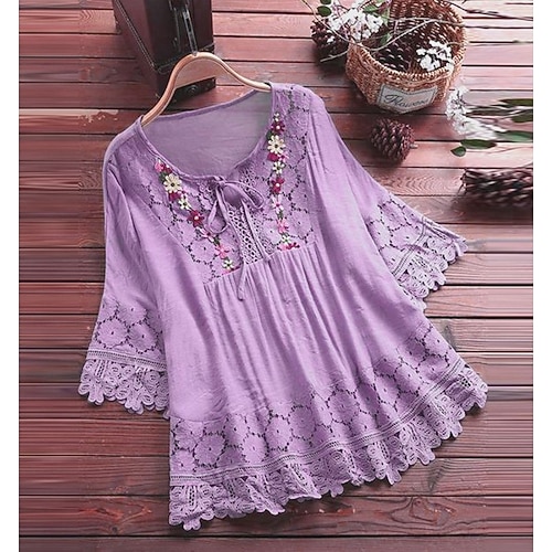 Per donna Camicia Camicie di cotone e lino Blusa Tinta unica Essenziale Casual Manica 3/4 Girocollo Top Regolari Quotidiano Pizzo Patchwork Nero Giallo Rosa Verde Estate