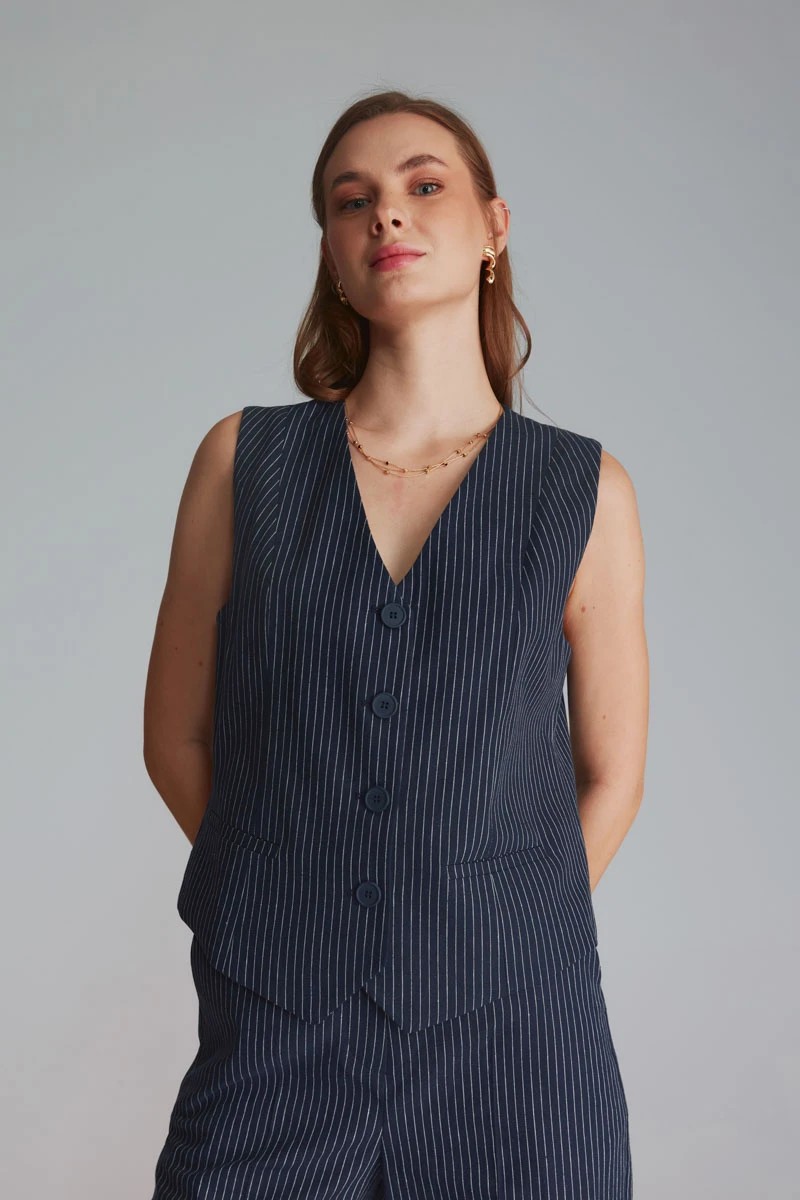 Gusto Womens Striped Linen Waistcoat - Navy - Size X-large | Gusto Sale | Discount Designer Brands