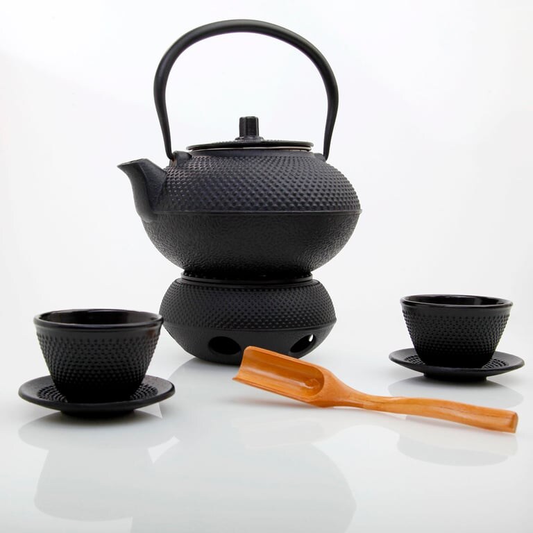 Lumaland Tee Set 8-teilig - 1,4 Liter Gusseiserne Teekanne Tetsubin - Stövchen aus Gusseisen - 2 Teebecher & 2 Untersetzer - Schwarz