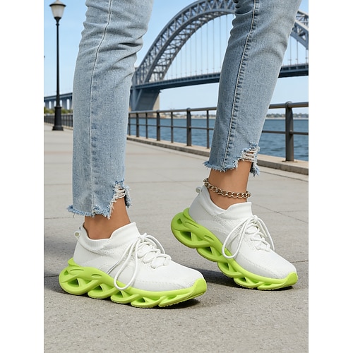 sneakers da donna Flyknit bianche e rosa - scarpe traspiranti, leggere, con lacci e suola spessa ammortizzata, perfette per passeggiate quotidiane, corsa, commissioni informali e passeggiate del fine settimana