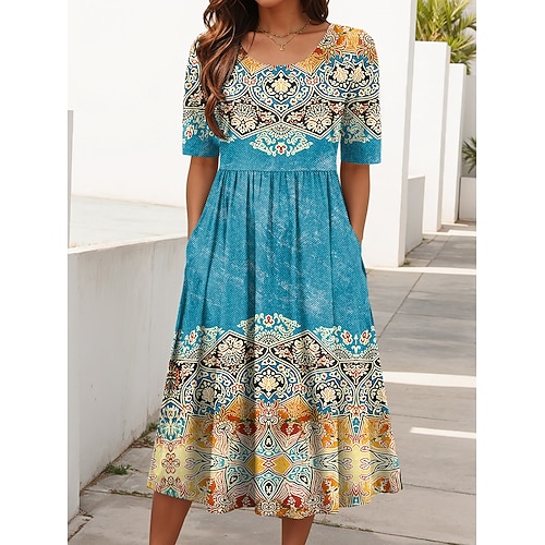 Per donna Abito Midi Abito Estivo Abito Pieghettato Vacanza Casual Ferie Vestibilità regolare Grafico Geometrico Mezza Manica Girocollo Rosso Blu Viola Estate Primavera