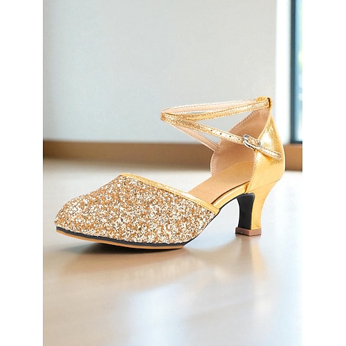 scarpe da ballo da donna con glitter dorati, cinturini incrociati e fibbia regolabile - tacchi comodi per salsa e balli da sala