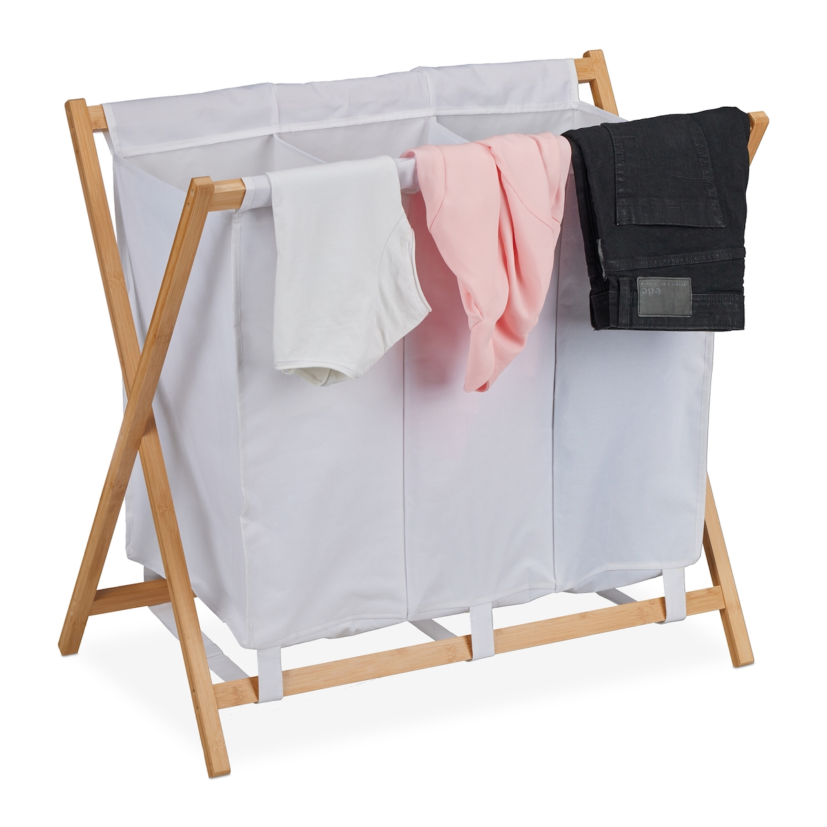 Relaxdays Wäschekorb, 3 Fächer mit je 38 L, klappbarer Wäschesammler, Bambusgestell, HxBxT: 71 x 74 x 42 cm, weiß/natur