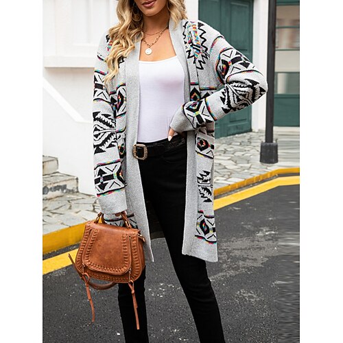 Per donna Felpa Cardigan Vacanza Streetwear Stile Etnico Geometrico Blocco di colori Aperto davanti Tasca Lavorato a maglia Manica Lunga Top lunghi Maglia All'aperto Quotidiano Weekend Cachi Grigio