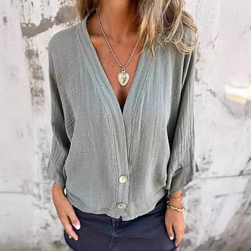 Per donna Camicia di lino Tinta unica Elegante Bohemien Vintage Manica Lunga Scollo a V Top Regolari Quotidiano Ferie Bottoni Verde pavone Nero Giallo Grigio scuro Albicocca Estate Primavera Autunno