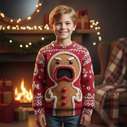 Natale Ragazzi 3D Omino di marzapane Maglione di Natale brutto regalo di Natale Felpa Manica Lunga Stampa 3D Autunno Inverno Moda Festa Bambini 4-12 Anni Girocollo All'aperto Quotidiano Vestibilit