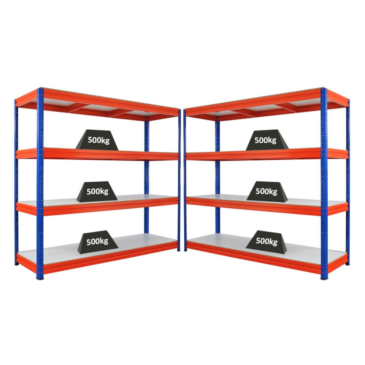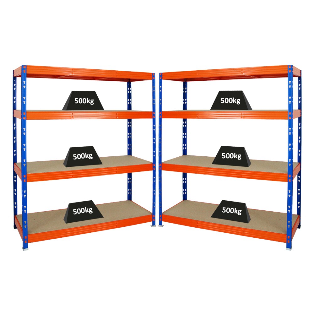 Proregal Mega Deal | 2x Schwerlastregal DINO | HxBxT 180x200x60cm | 4 Melamin-Ebenen 16mm | Fachlast 500kg | Blau/Orange