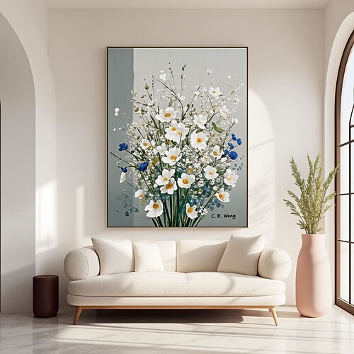 dipinto a olio originale fatto a mano con texture 3d di fiori su tela, arte murale floreale bianca astratta per l'arredamento della casa con cornice tesa senza cornice interna