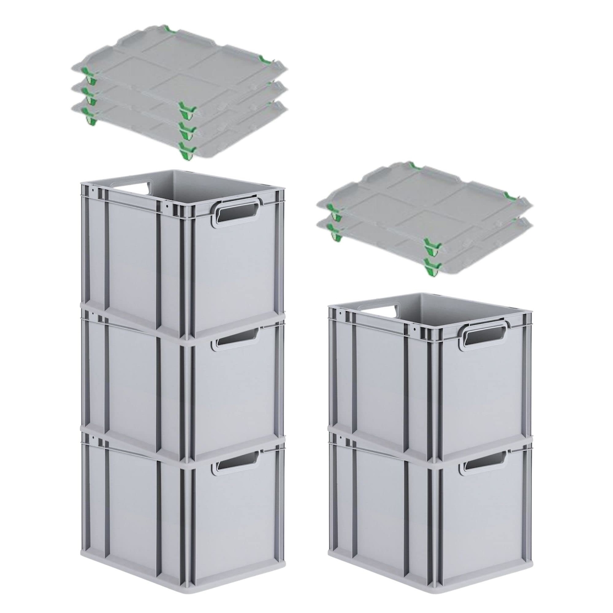 PROREGAL SparSet 5x Eurobox NextGen Economy mit Auflagedeckel & 4x Verschlüsse Grün, Griffe offen, HxBxT 32x30x40cm, 30L, Eurobehälter, Box